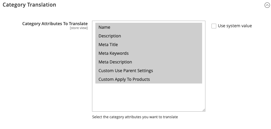 - Translate specific category attributes, such as Name, Description, and Meta Details.
